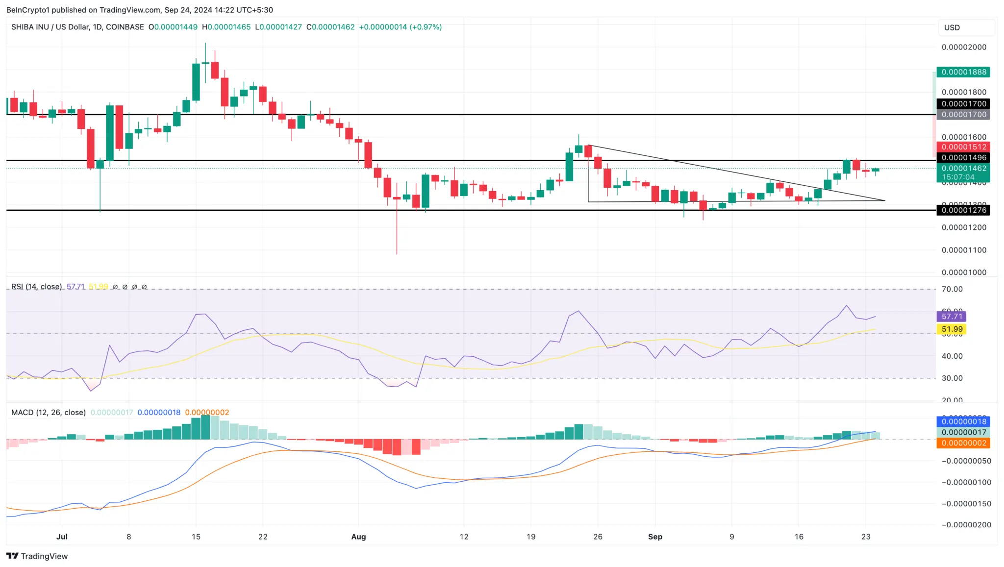 O gráfico diário mostra como a Shiba Inu negociou dentro de um triângulo de baixa entre 25 de agosto e 18 de setembro. Esse movimento limitado impediu o token de alcançar um aumento significativo.
