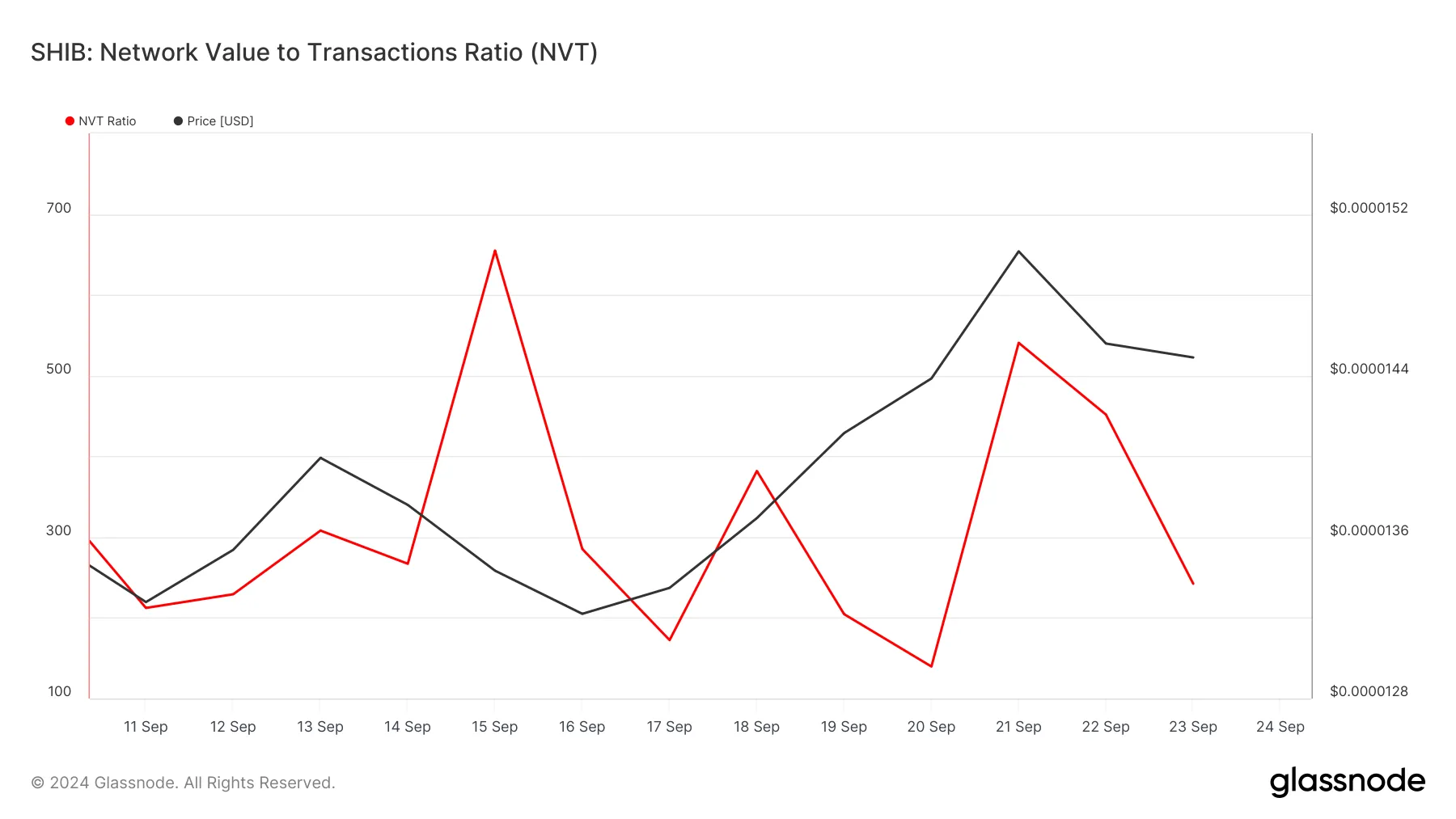 Valores altos da relação NVT indicam um crescimento maior do valor de mercado e geralmente significam que o preço atingiu o topo local. Como a relação NVT caiu no caso da SHIB, o volume de transações parece estar superando o crescimento do valor de mercado, indicando que o preço está em um bom ponto de compra.