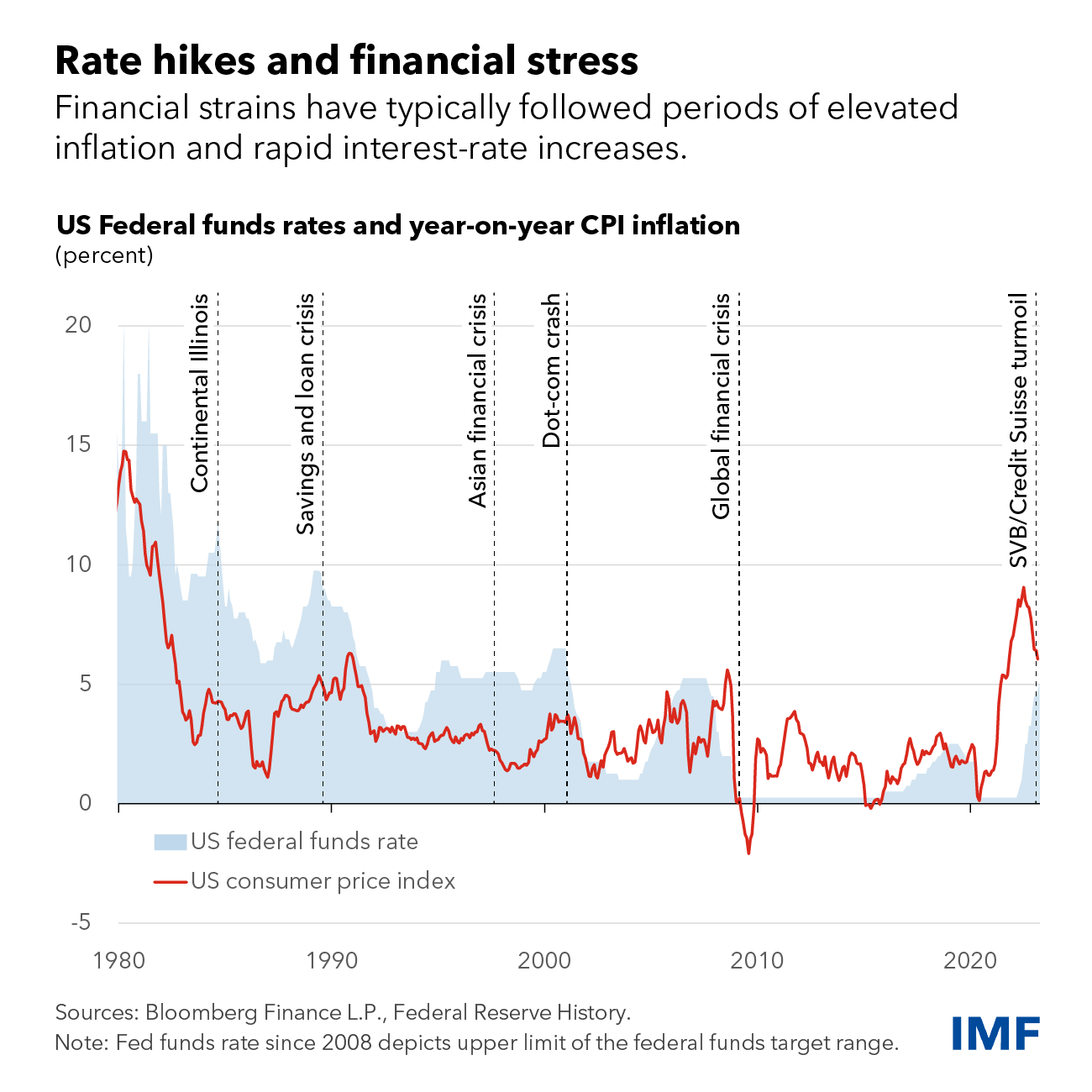 O FMI cita as falências do Silicon Valley Bank e do Signature Bank nos Estados Unidos. Ambas causadas pela fuga de depositantes sem seguro. Estes perceberem que as altas taxas de juros levaram a grandes perdas nas carteiras de títulos desses bancos.