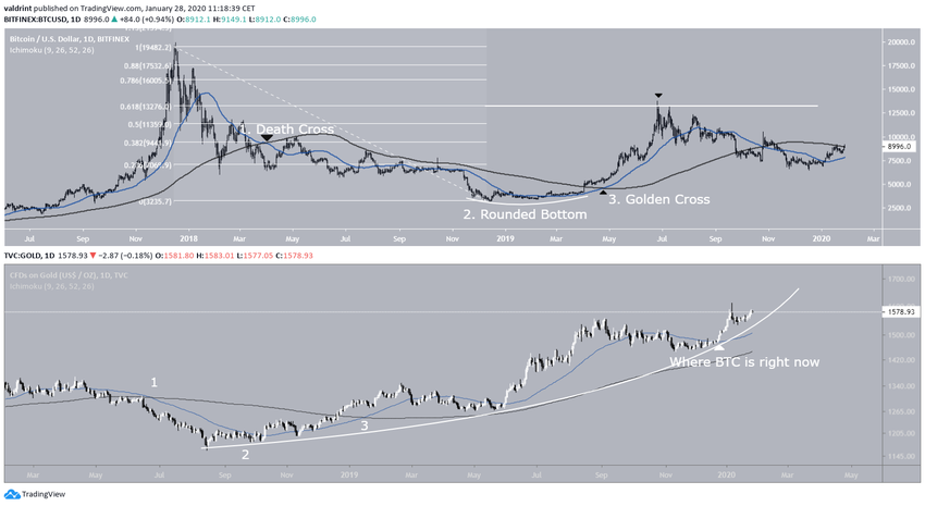 Seeing a lot of similarities with $BTC and #Gold. Notice how gold formed a beautiful bull flag as it pulled back and into a weekly golden cross. This was shortly after forming a very nice rounded bottom. #Bitcoin appears to be mirroring this action on the daily. 🚀 pic.twitter.com/wU4hONu39d