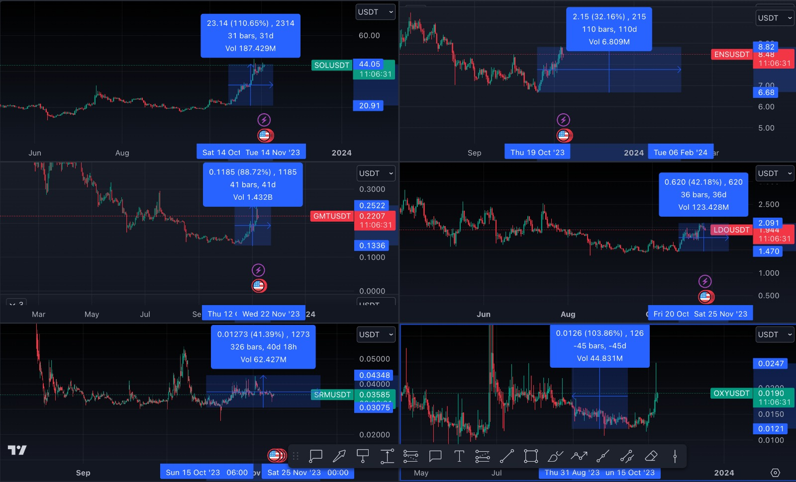 Para dar uma perspectiva mais abrangente, ele compartilhou exemplos de algumas outras participações na FTX que tiveram desempenho superior ao do mercado desde meados de outubro. Por exemplo, SOL subiu 110%, Ethereum Name Service (ENS) bombeou 32%, Stepn (GMT) disparou 88%, Lido DAO (LDO) subiu 42%, Serum (SRM) subiu 41% e, por último, Oxygen O protocolo (OXY) dobrou desde meados de outubro.