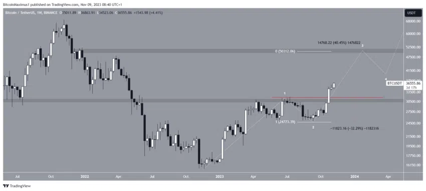 Se a contagem estiver correta, o BTC está atualmente na terceira onda deste movimento de cinco ondas. Dar às ondas um e três uma proporção de 1:1 levará a uma alta de US$ 50.300. Isso também se alinha com uma área de resistência horizontal. A meta é 40% acima do preço atual.