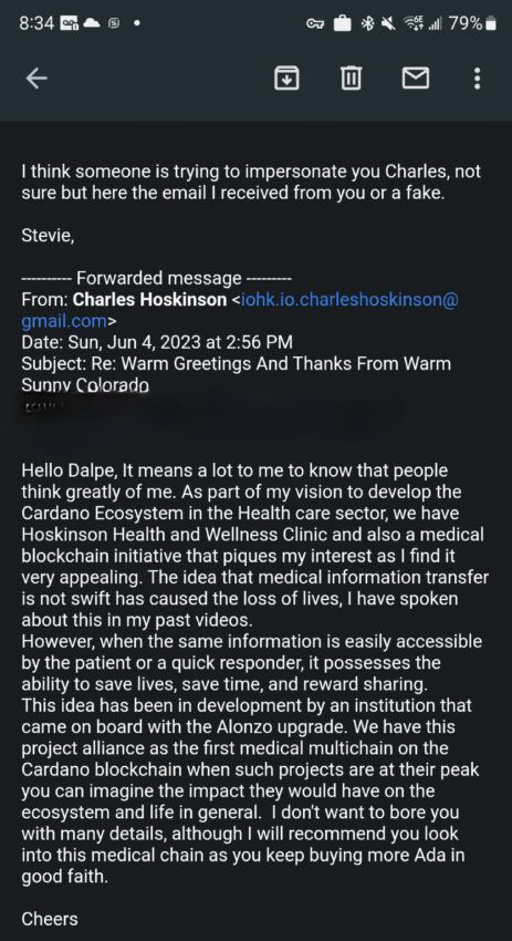 Hoskinson se referiu a um incidente em que lhe disseram que alguém estava se passando por ele, dizendo: