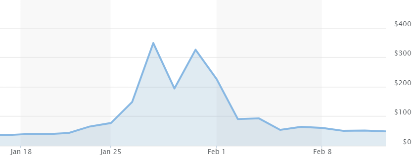Se no final de janeiro as ações chegaram ao valor máximo de US$ 483, no dia de hoje, 11 de fevereiro, a GME está valendo US$ 48. Ou seja, a GameStop está cotada hoje a um valor nove vezes menor do que seu recorde.