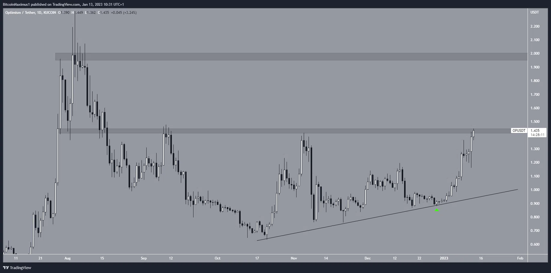 A OP subiu ao longo de uma linha de suporte ascendente desde 20 de outubro. O token saltou na linha em 29 de dezembro, iniciando o atual movimento ascendente. Desde então, a OP aumentou 65%.