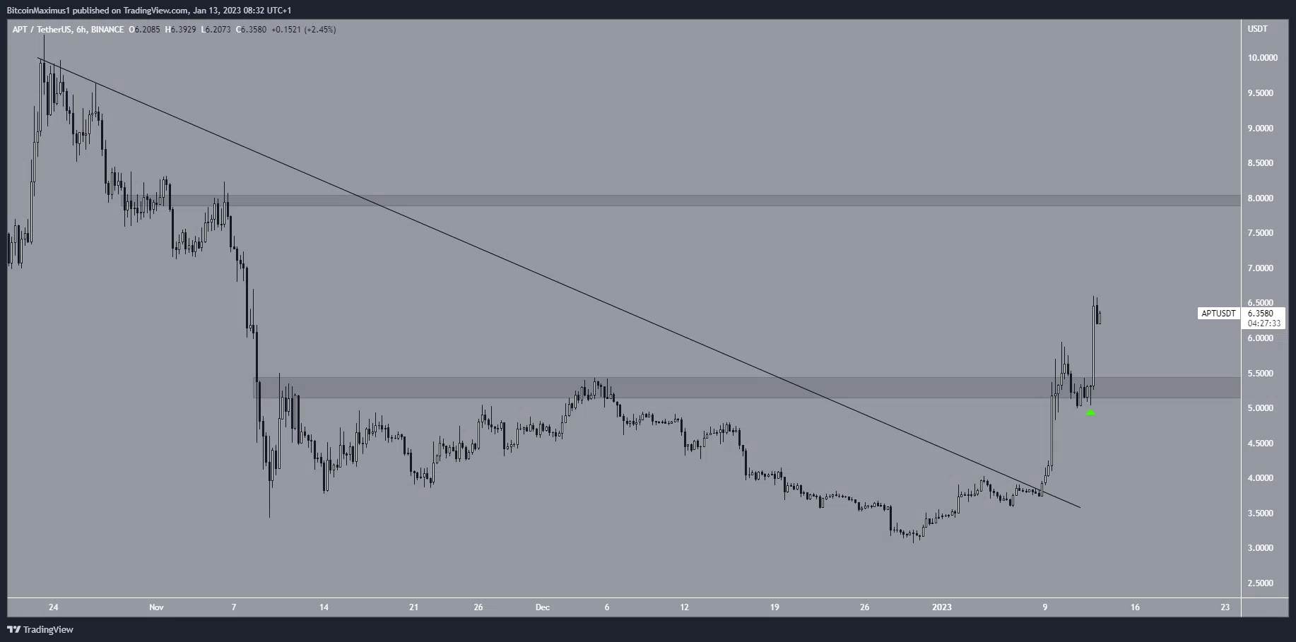 O APT saiu de uma linha de resistência descendente em 8 de janeiro e acelerou sua taxa de aumento. Logo em seguida rompeu acima da área de resistência de US$ 5,20. Em 12 de janeiro, validou a região como suporte (ícone verde). Se o movimento ascendente continuar, a próxima resistência será de US$ 8.