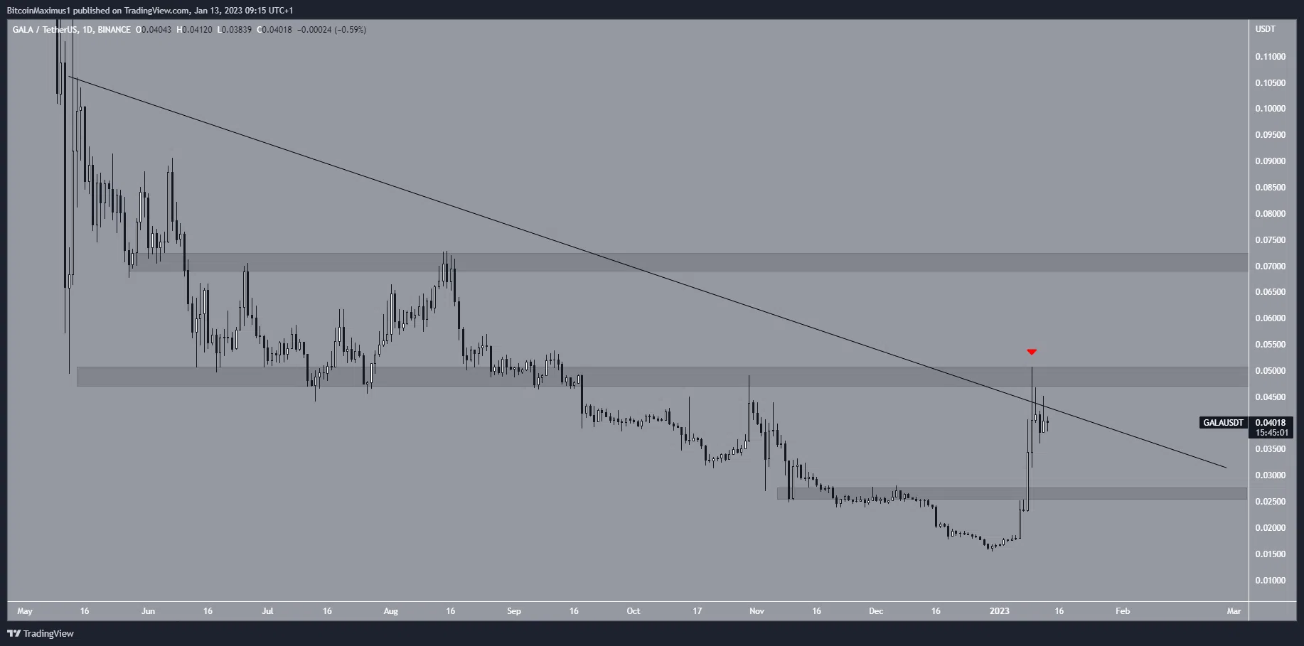 Em 9 de janeiro, a GALA atingiu uma máxima de US$ 0,05, mas foi rejeitada pela linha de resistência descendente e pela área de resistência de US$ 0,05 (ícone vermelho). A altcoin caiu desde então.