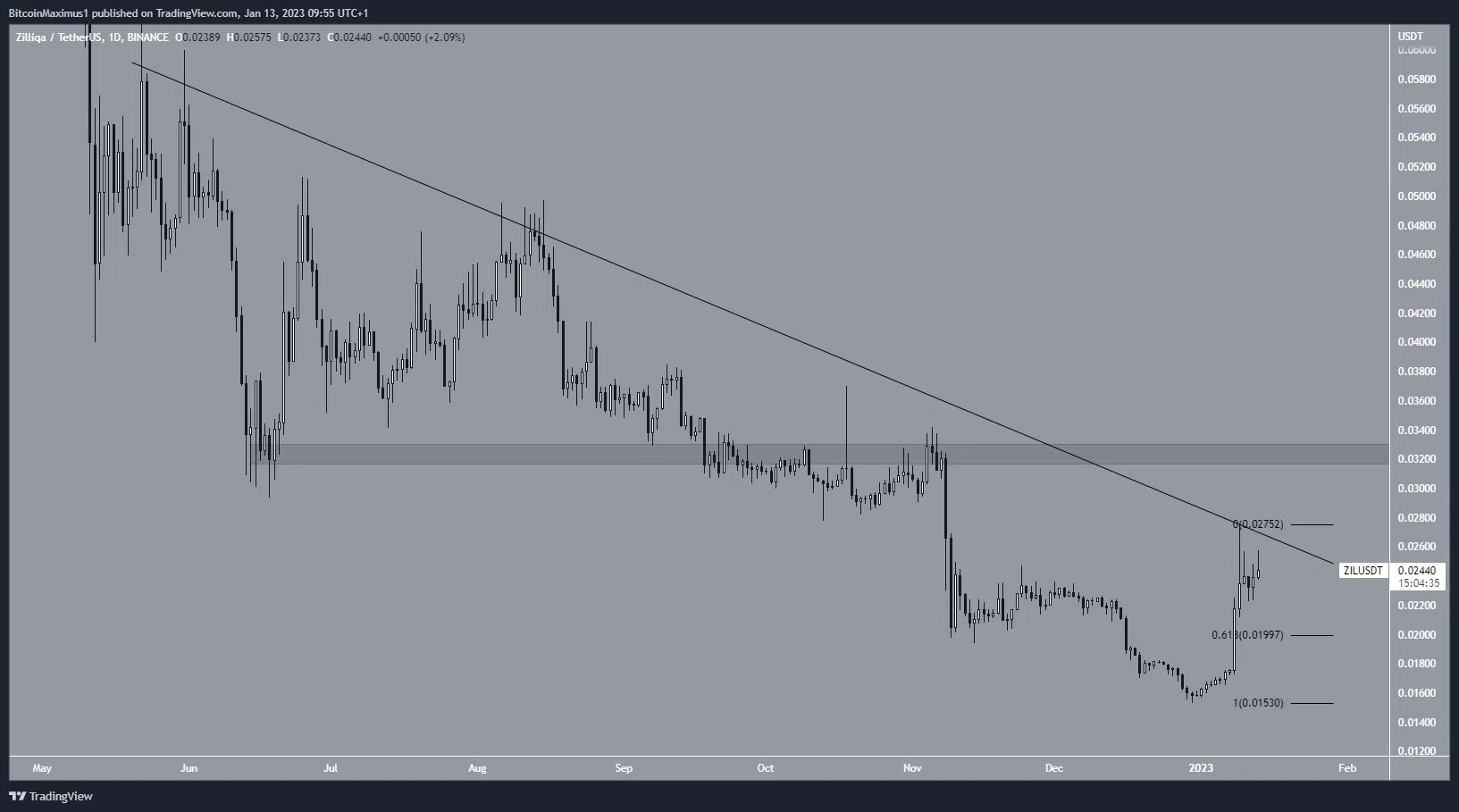 A ZIL subiu desde 30 de dezembro. Em 9 de janeiro, atingiu a máxima de US$ 0,027. No entanto, não conseguiu ultrapassar a linha de resistência descendente em vigor desde maio. Em vez disso, foi rejeitada e criou um longo pavio superior (ícone vermelho). A ZIL está fazendo outra tentativa de romper a linha.