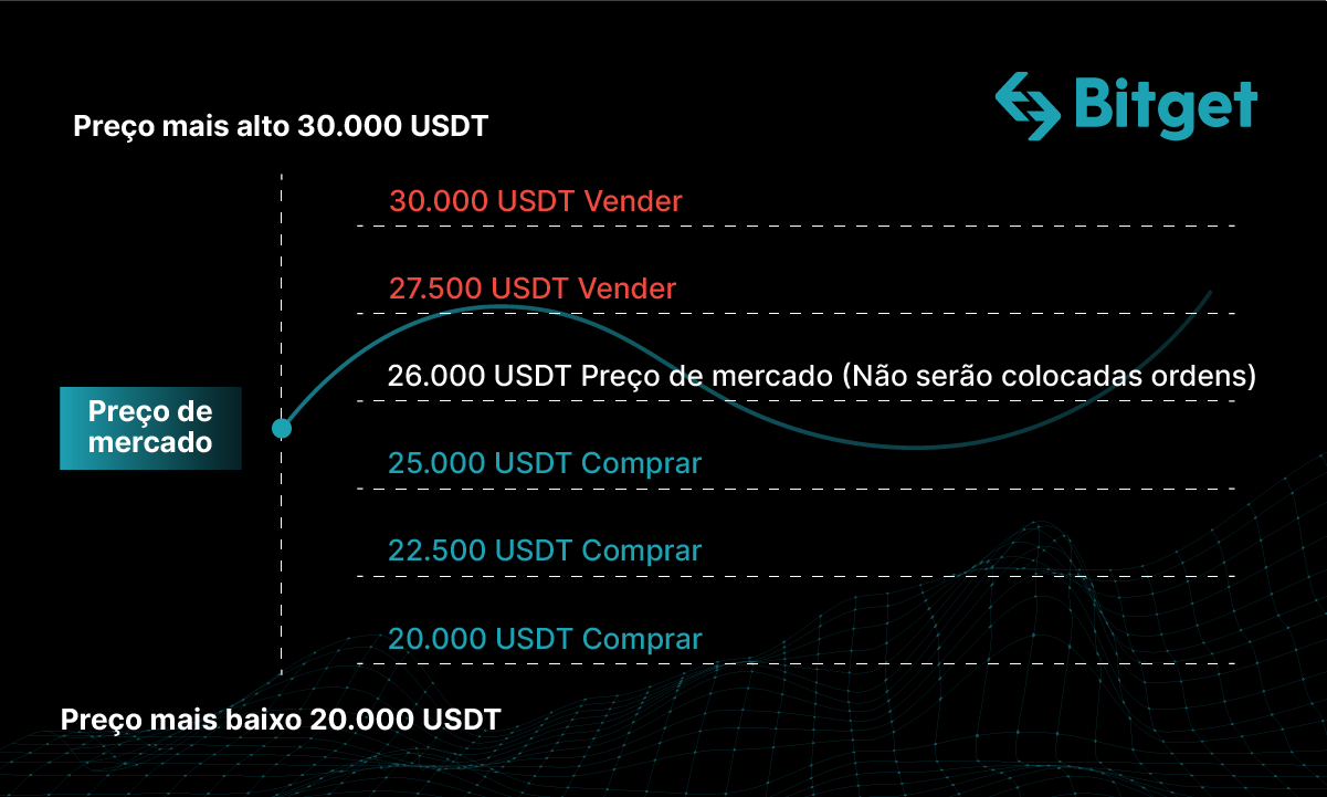 Quando o preço sobe para 27.500 USDT, nenhuma ordem de compra/venda será acionada, pois simplesmente não há posições abertas. No entanto, quando o preço subir para 30.000 USDT, uma ordem de venda será colocada em 30.000 USDT e uma ordem de compra em 27.500, dando início novamente ao sistema de grid.