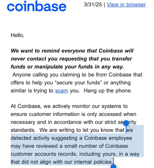 Essa violação levantou preocupações sobre possíveis golpes direcionados a usuários da Coinbase. Mike Dudas, investidor de cripto e cofundador da The Block, compartilhou um e-mail da Coinbase reconhecendo o incidente.