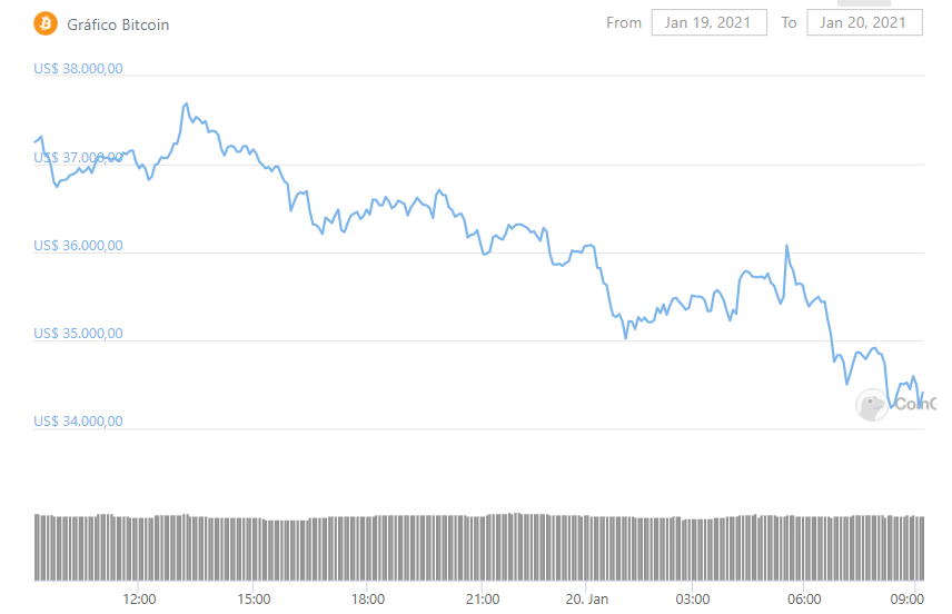 O bitcoin registra agora uma queda de cerca de 8% nas últimas 24 horas. Enquanto a criptomoeda era cotada a US$ 37.626 no início nesta terça-feira (19), o preço chegou a cair para até US$ 34.291 nesta manhã de quarta, conforme dados do CoinGecko.