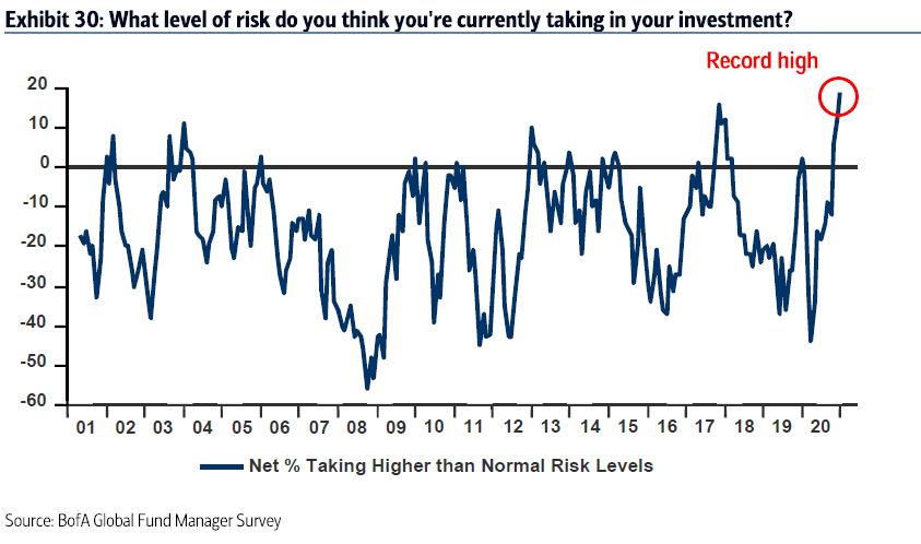 De acordo com o BofA, um recorde de 19% dos investidores estão assumindo mais riscos do que o normal em suas carteiras de investimentos. Essa porcentagem possui sob sua gestão mais de US$ 500 bilhões em ativos.