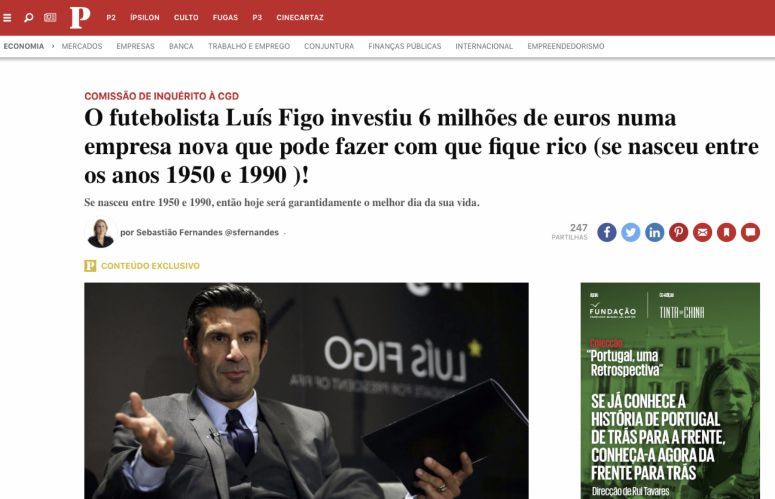Duas entrevistas de Luís Figo aparecem entre as chamadas para a entrada no negócio. Embora as entrevistas sejam verdadeiras, o contexto da fala do ex-jogador do Real Madrid é distorcido, tanto em entrevista ao Público quanto em uma publicação da Forbes.