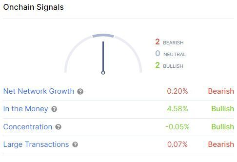 O número de carteiras ETH com mais de 1.000 unidades do token saltou para uma alta de 15 meses à medida que a fusão se aproxima. Dados do IntoTheBlock revelaram que os indicadores mostram que 58% dos detentores estão ganhando dinheiro nos níveis atuais de preços e 40% de todas as participações do Ethereum são detidas por baleias, parâmetros otimistas para o ativo. No entanto, o crescimento líquido da rede e os grandes sinais de transação permanecem em baixa atualmente.