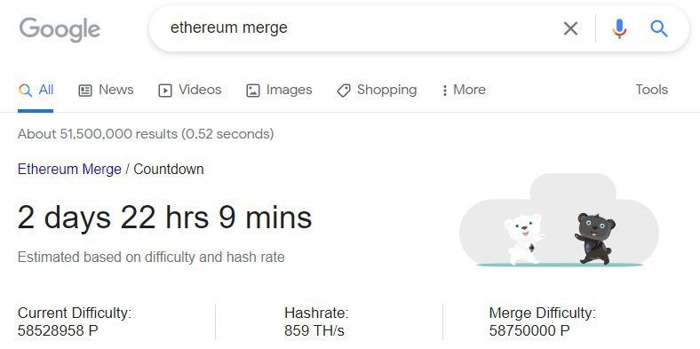 Sam Padilla, desenvolvedor de blockchain do Google Cloud, demonstrou a atualização mais recente da Pesquisa do Google neste identificador do Twitter, que apresenta uma contagem regressiva do The Merge em tempo real. Chamando isso de “pequena surpresa” para o “pessoal do Ethereum”, Padilla declarou: “Todo mundo está tão animado com o que está por vir e aprecia o trabalho que vem acontecendo há anos”.