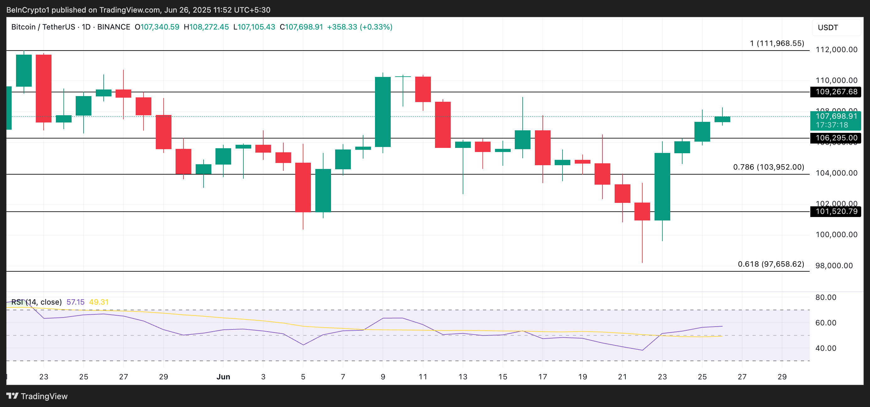 Com o RSI em 57,15 e em trajetória de alta, a demanda crescente pode impulsionar o BTC além da resistência de US$ 109.267, com possível avanço rumo à sua máxima histórica de US$ 111.968.