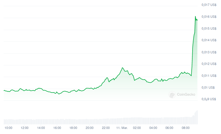 Desde então, caiu ligeiramente e atualmente é negociado a US$ 0,0149, segundo dados do CoinGecko. Este token específico está localizado na posição 520 no ranking de valor de mercado, com uma capitalização de US$ 100,4 milhões.