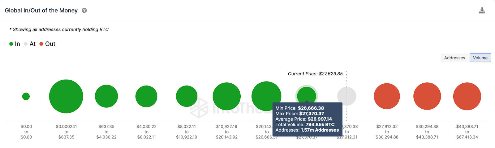 O The Global In/Out of the Money (GIOM) também confirmam esta narrativa. O indicador mostra que os 1,57 milhão de endereços compraram 794.850 BTC ao preço mínimo de US$ 26.600.