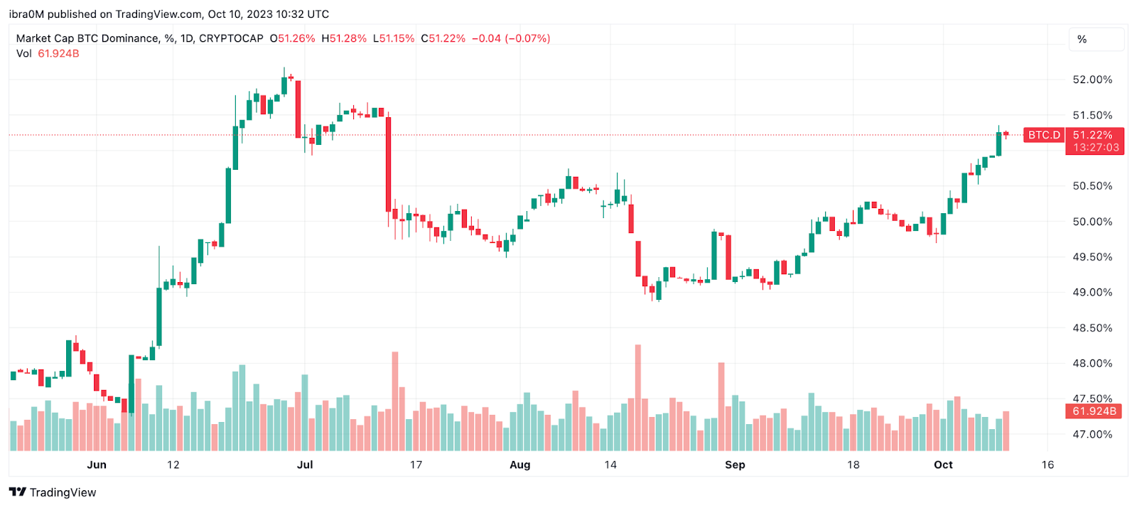 Nesta terça-feira (10), o Índice de Dominância do Bitcoin (BTC.D) ultrapassou 51%, o maior desde 12 de julho.