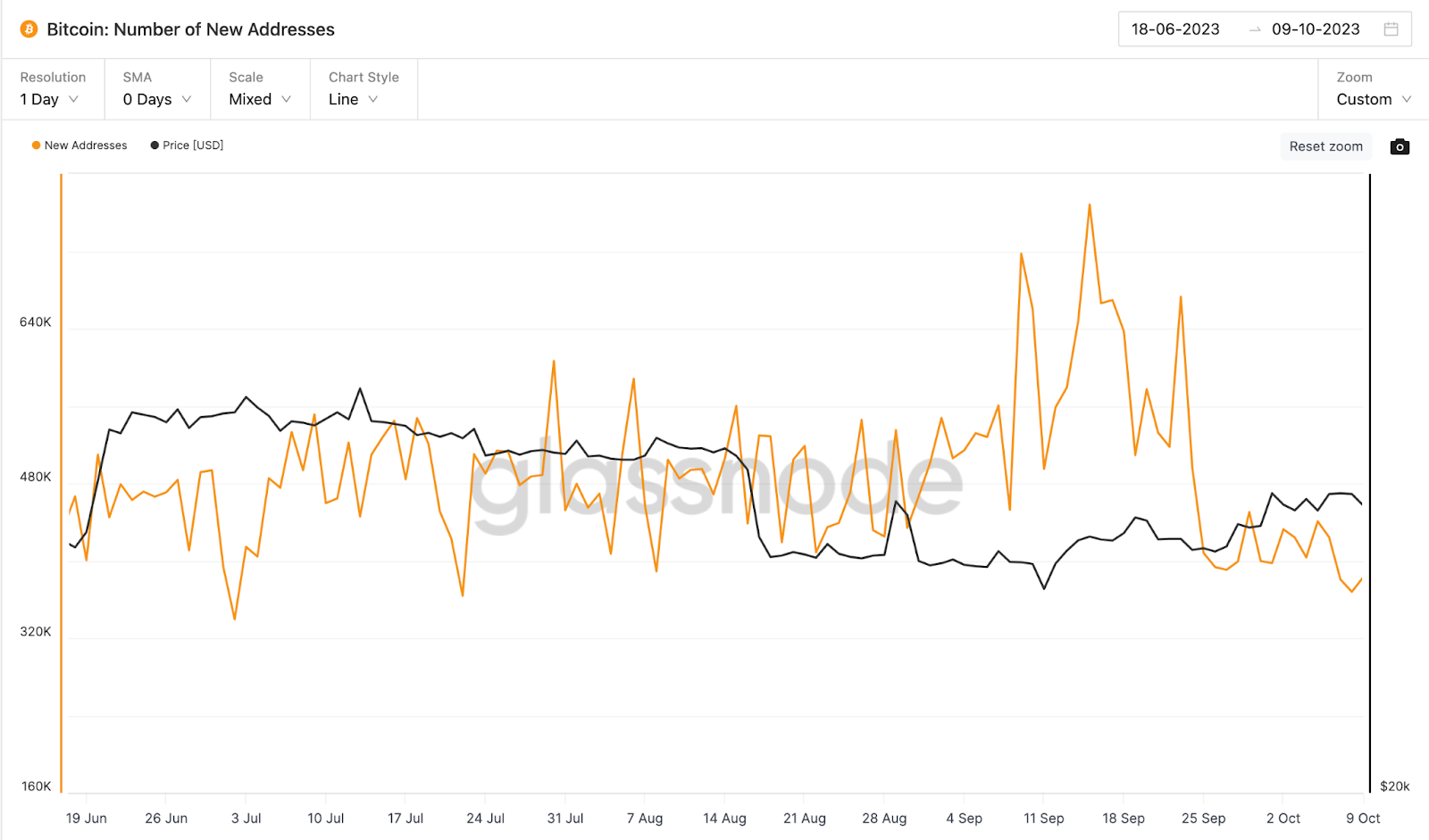 Apenas 367.874 novos endereços foram criados na rede em 8 de outubro. De acordo com o gráfico da Glassnode abaixo, a taxa de aquisição de novos endereços não caiu para um nível tão baixo desde 22 de julho.