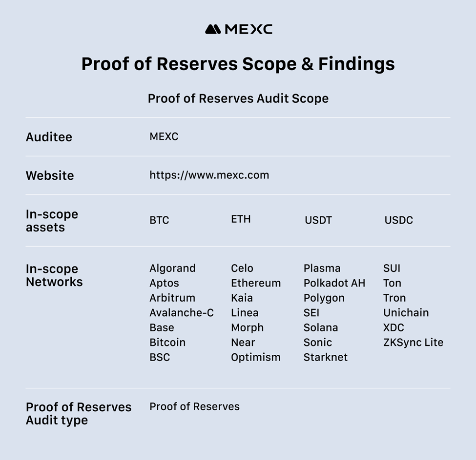 De acordo com a auditoria, a Hacken realizou uma avaliação abrangente das reservas da MEXC utilizando metodologias padrão do setor, incluindo Prova de Passivos, Prova de Propriedade, cálculos de suficiência de reservas e verificação por árvore de Merkle. O framework de Prova de Reservas da MEXC agrega saldos de usuários anonimizados e os mapeia para participações on-chain publicamente verificáveis, permitindo a validação independente da solvência sem comprometer informações pessoais. O auditor verificou que a MEXC mantém controle operacional sobre todas as carteiras incluídas na avaliação e confirmou que os saldos dos usuários estão totalmente lastreados com base nos ativos analisados.