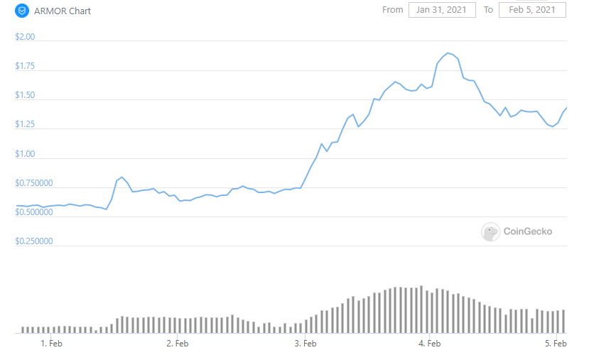 SponsoredConforme dados do CoinGecko, na segunda-feira (1) o ARMOR estava valendo US$ 0,58. Nesta sexta, a criptomoeda já subiu para US$ 1,51, ou seja, uma valorização de 160%. Além disso, a criptomoeda ontem bateu a sua máxima histórica de US$ 1,95.
