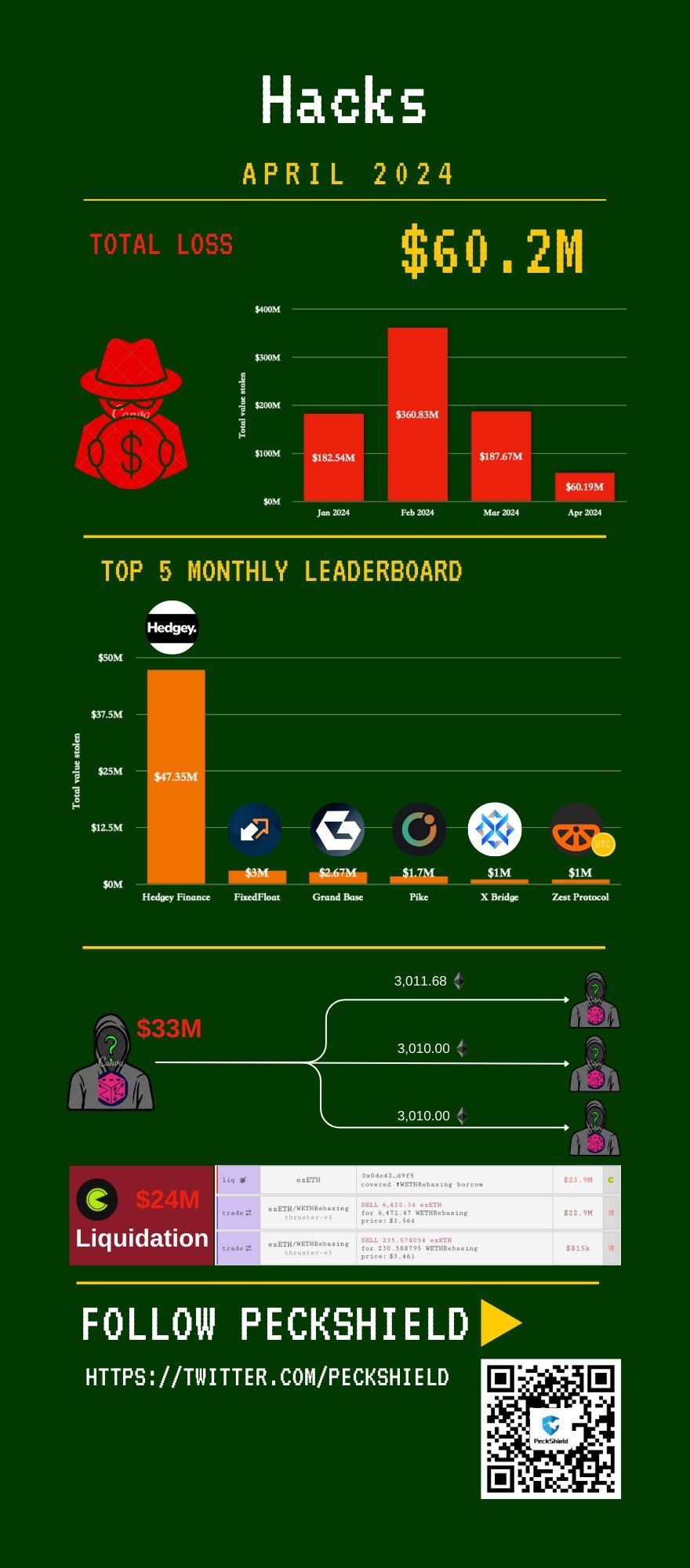 O resumo de segurança de abril da PeckShield detalha ainda mais várias violações de segurança significativas. Primeiro, a HedgeyFinance foi a mais atingida, perdendo cerca de US$ 47,35 milhões.