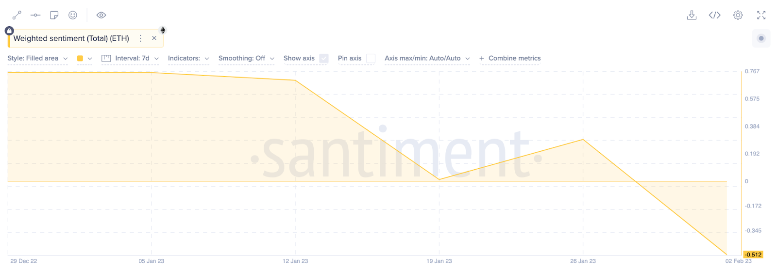 Os dados de sentimento ponderados da Santiment mostram que a percepção social em torno do Ethereum é amplamente negativa. Mas tudo isso pode mudar rapidamente se os saques da rede de teste de Zhejiang forem bem-sucedidas sem grandes preocupações técnicas. O testnet de Zhejiang está programado para ser lançado nesta terça-feira (7), antes da implementação do hard fork Shanghai em março.