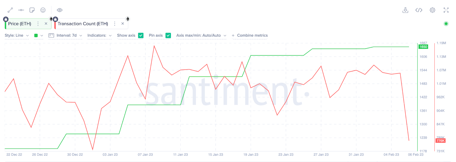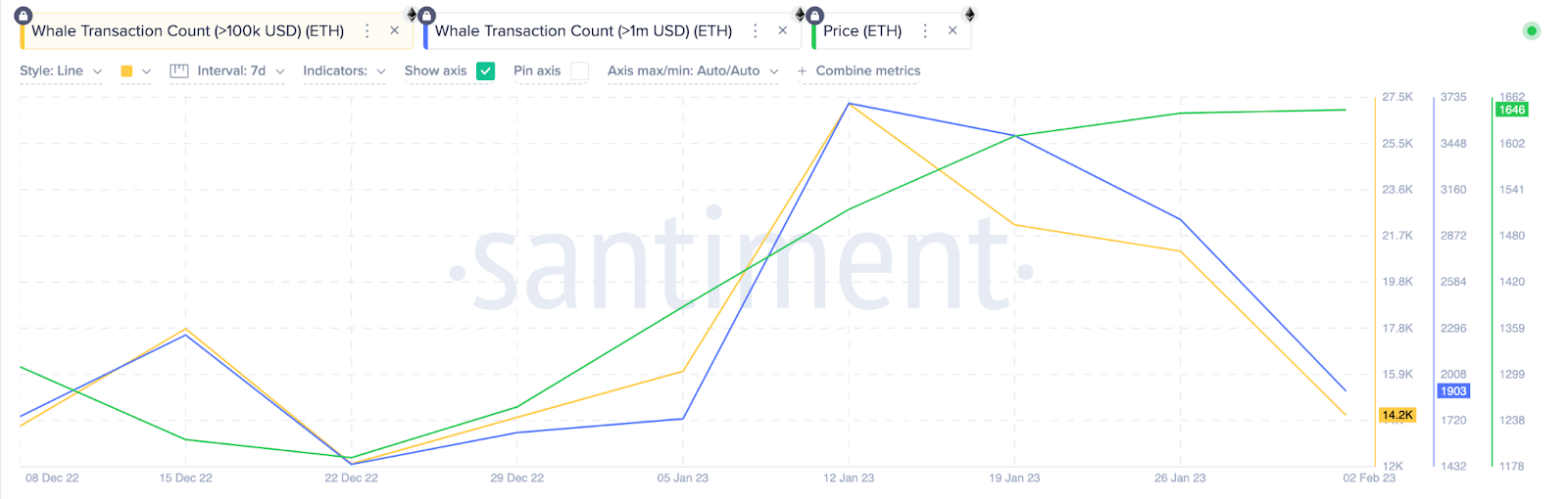 Após o anúncio de 31 de janeiro da testnet de Zhejiang, que permitiria testar a funcionalidade de retirada de staking, o ETH permaneceu estável em torno da marca de US$ 1.600. No mesmo período, o interesse das baleias pelo token diminuiu.