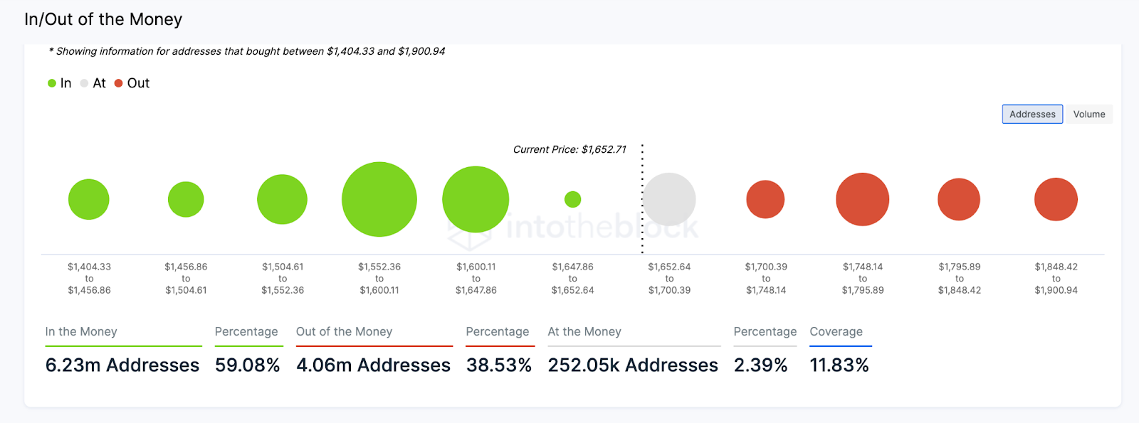 Os dados In/Out of the Money (IOMAP) do IntoTheBlock mostram que é mais provável que o ativo rompa a resistência de US$ 1.700 do que perca seu suporte de US$ 1.400. A IntoTheBlock estima os dados do IOMAP comparando os preços de compra de ETH mantidos em carteiras com os preços atuais.