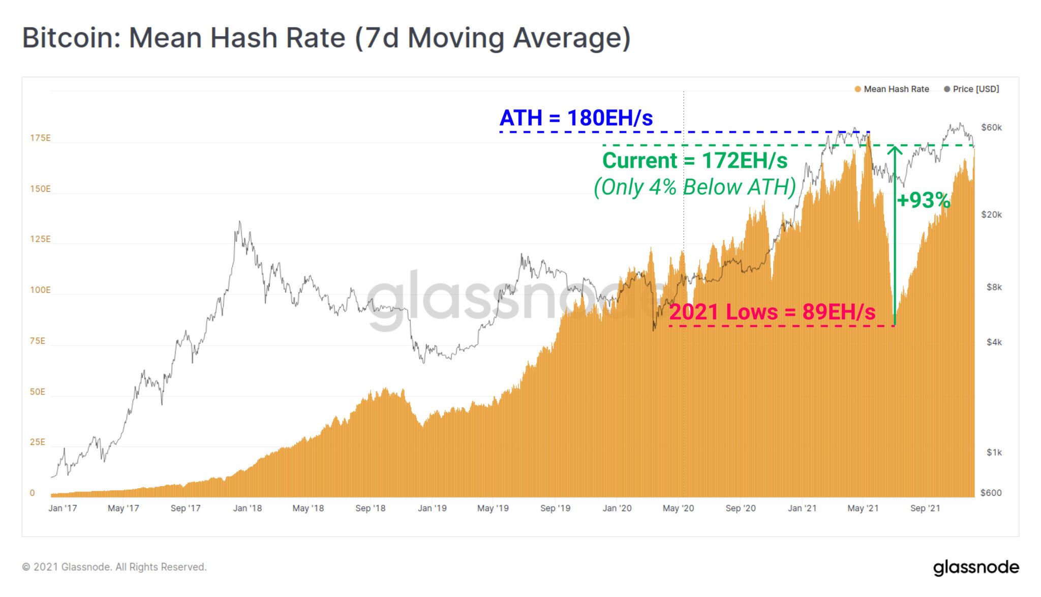O provedor de análises on-chain Glassnode observou que houve uma grande recuperação na taxa de hash da rede Bitcoin. Nesta quarta-feira (8), a empresa informou que a hash rate está agora a apenas 4% de seu recorde histórico de 180 EH/s (exahashes por segundo), que ocorreu em meados de maio deste ano.