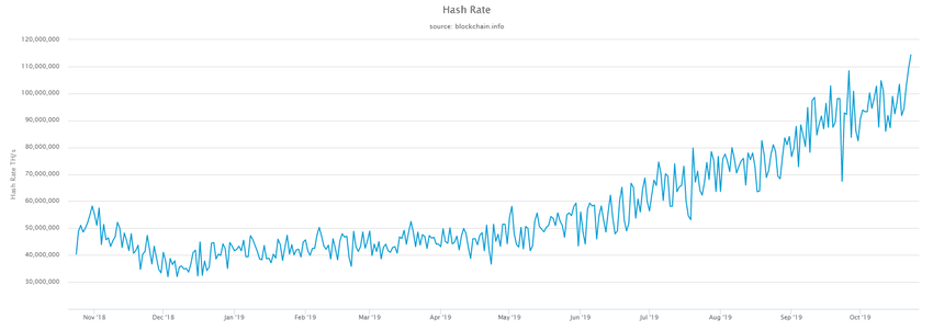 Apesar dos preços do Bitcoin caírem nos últimos dias, o setor de mineração de ativos continua a se expandir. De acordo com dados do Blockchain.com, o hashrate da rede agora é mais do que um enorme 114.342.000 TH / s. Embora o hashrate não se mova para cima ou para baixo de maneira linear, houve uma clara tendência ascendente para a métrica ao longo de 2019.