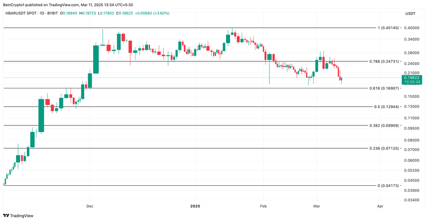 Um aumento sustentado na pressão de venda nos mercados à vista da HBAR faria com que sua queda de preço se estendesse no curto prazo. Nesse caso, seu preço poderia despencar para uma baixa de três meses de US$ 0,19.