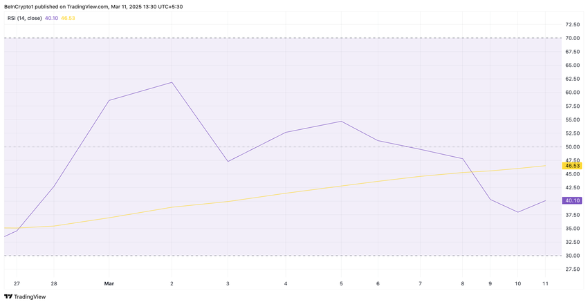 O Índice de Força Relativa (RSI) da HBAR também despencou, confirmando o aumento da pressão de venda à medida que investidores retiram fundos do mercado. No momento desta escrita, este indicador, que mede as condições de mercado sobrevendido e sobrecomprado de um ativo, está em 40,10.