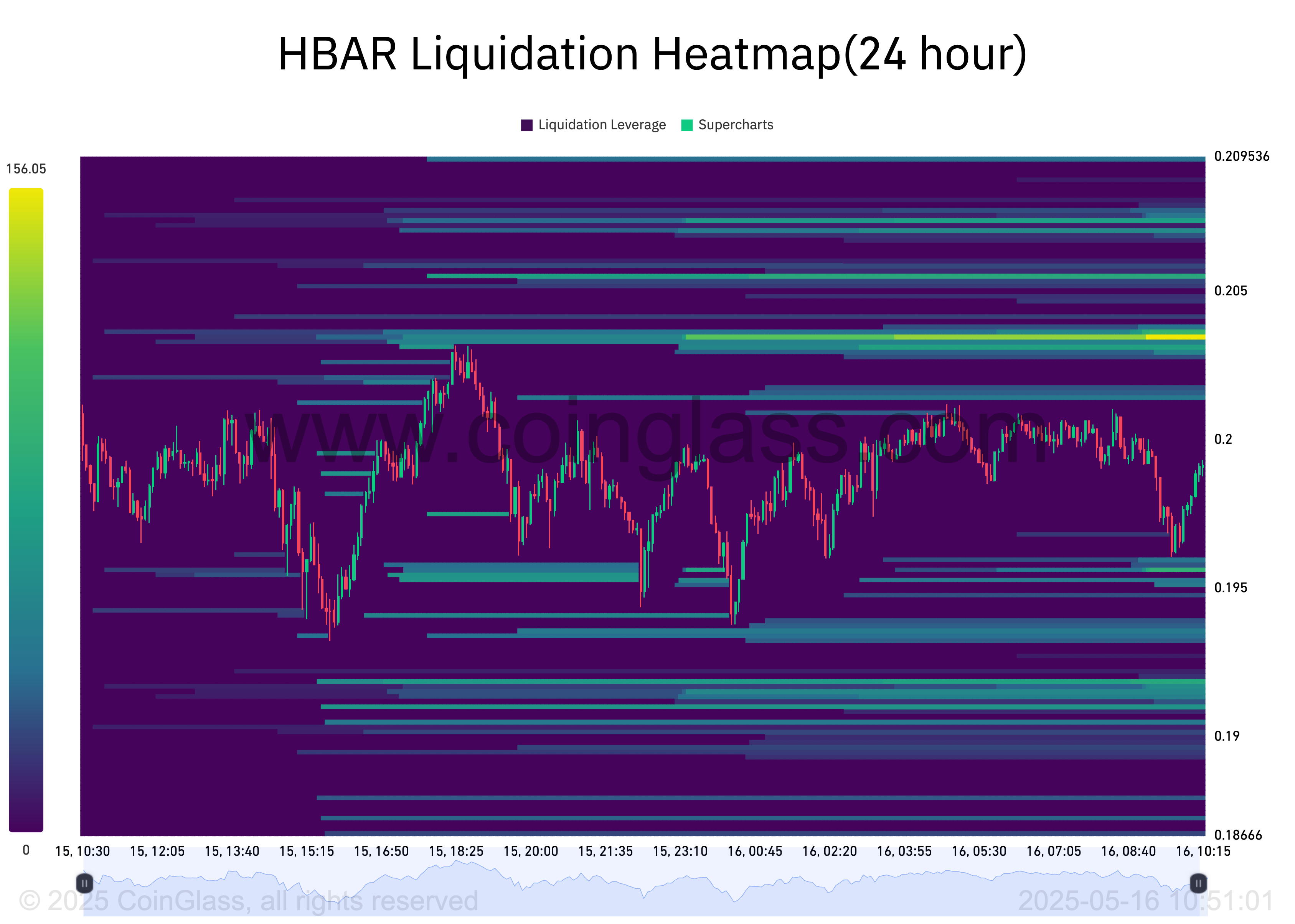 O heatmap de liquidação da HBAR indica uma concentração significativa de liquidez na região de preço de US$ 0,203. Os traders usam heatmaps de liquidação para identificar áreas onde um grande número de posições alavancadas provavelmente será liquidado se o preço atingir certos limites.