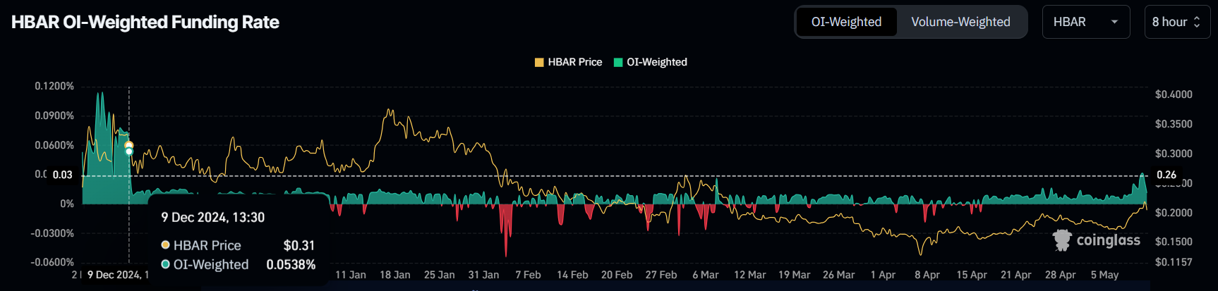 A taxa de financiamento para HBAR recentemente atingiu uma alta de cinco meses, sinalizando forte otimismo dos traders no mercado de Futuros. Contratos longos estão dominando os contratos curtos, sugerindo que os traders esperam que o preço continue subindo.