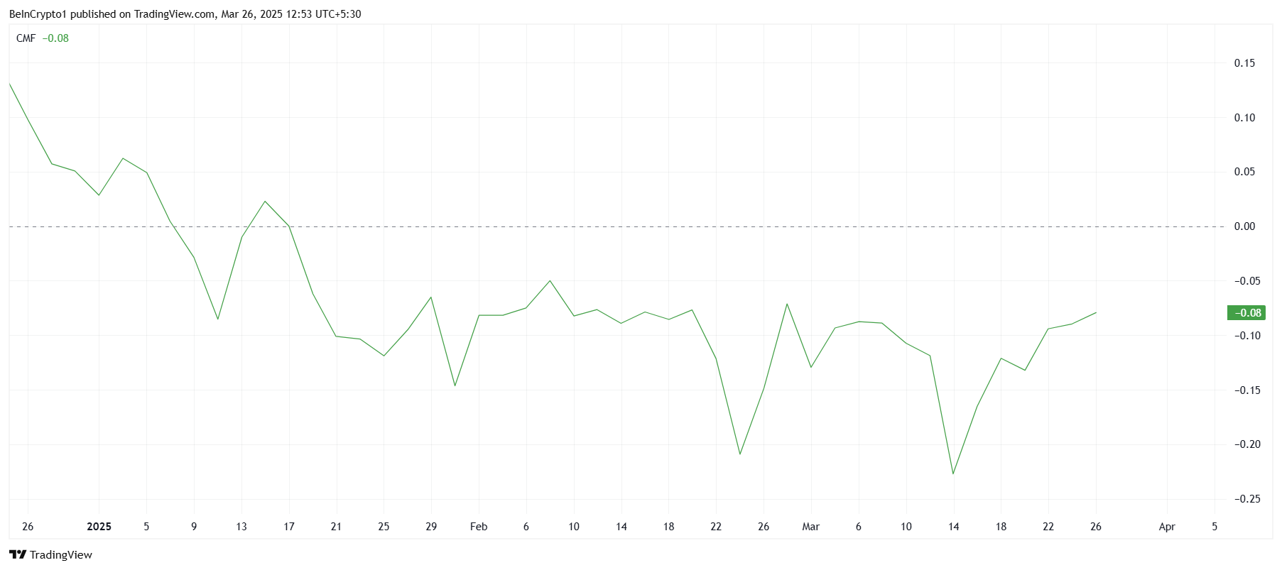 O indicador Chaikin Money Flow (CMF) tem mostrado entradas fracas desde o início do ano. Nos últimos dois meses, as entradas da HBAR foram superadas pelas saídas, uma tendência que fez o índice permanecer abaixo da linha zero. Essa falta de forte interesse de compra reflete a hesitação dos investidores, dificultando que a altcoin ganhe um impulso de alta sustentado.
