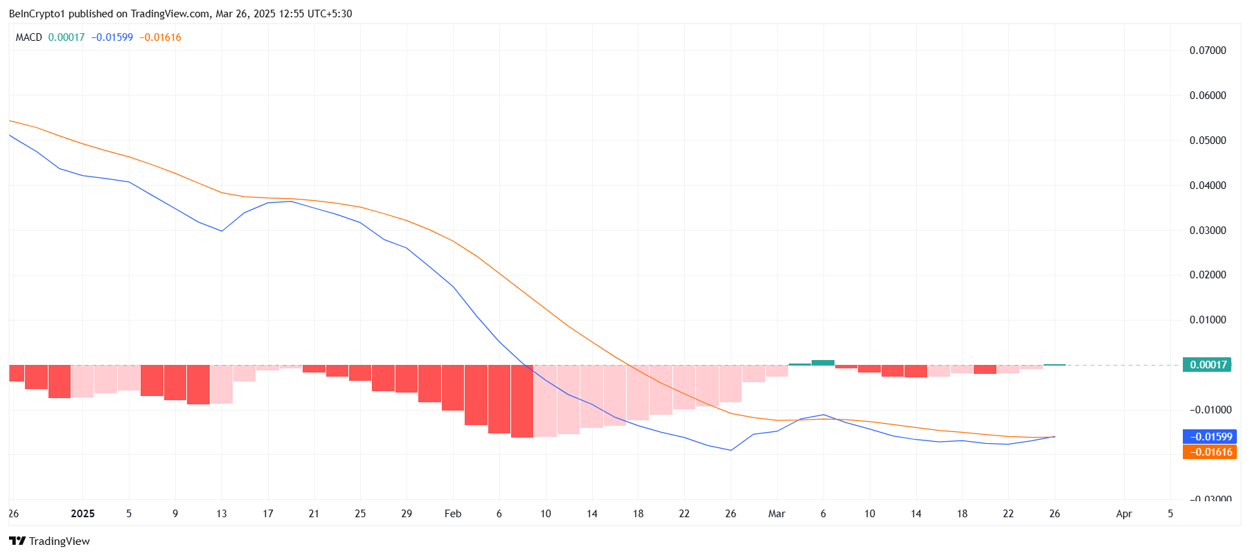 Em termos de momento macro, o Moving Average Convergence Divergence (MACD) tem mostrado sinais mistos. Nas últimas três semanas, o momento da HBAR mudou de alta para baixa, e agora, voltou a ser de alta novamente. Embora isso possa parecer um sinal positivo, a falta de momento consistente torna improvável que a tendência de alta seja sustentável.