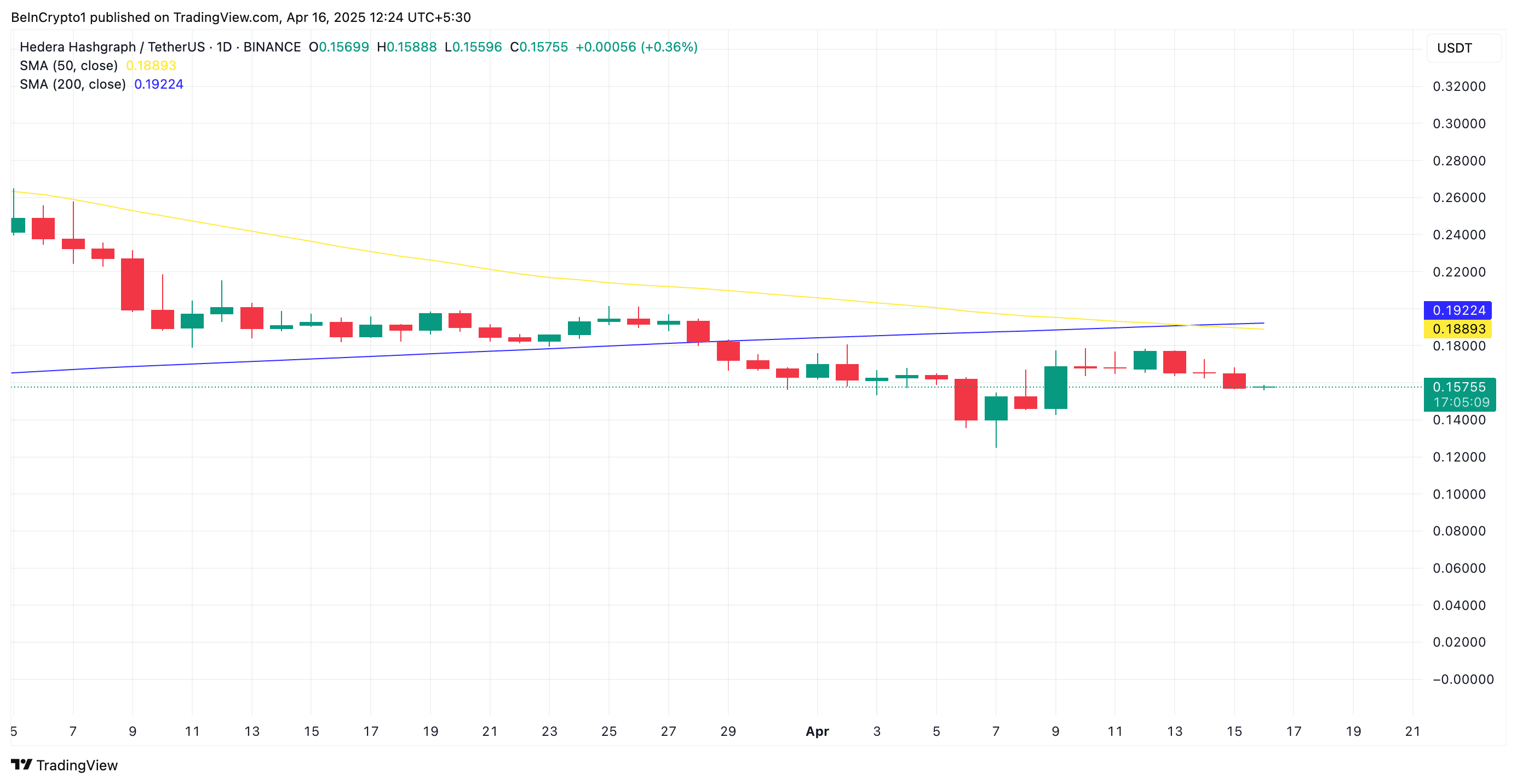 Além disso, uma “cruz da morte” surgiu no gráfico de um dia do HBAR/US$, adicionando ao cenário sombrio. Este é um padrão de baixa formado quando a média móvel de 50 dias de um ativo cruza abaixo da média móvel de 200 dias.