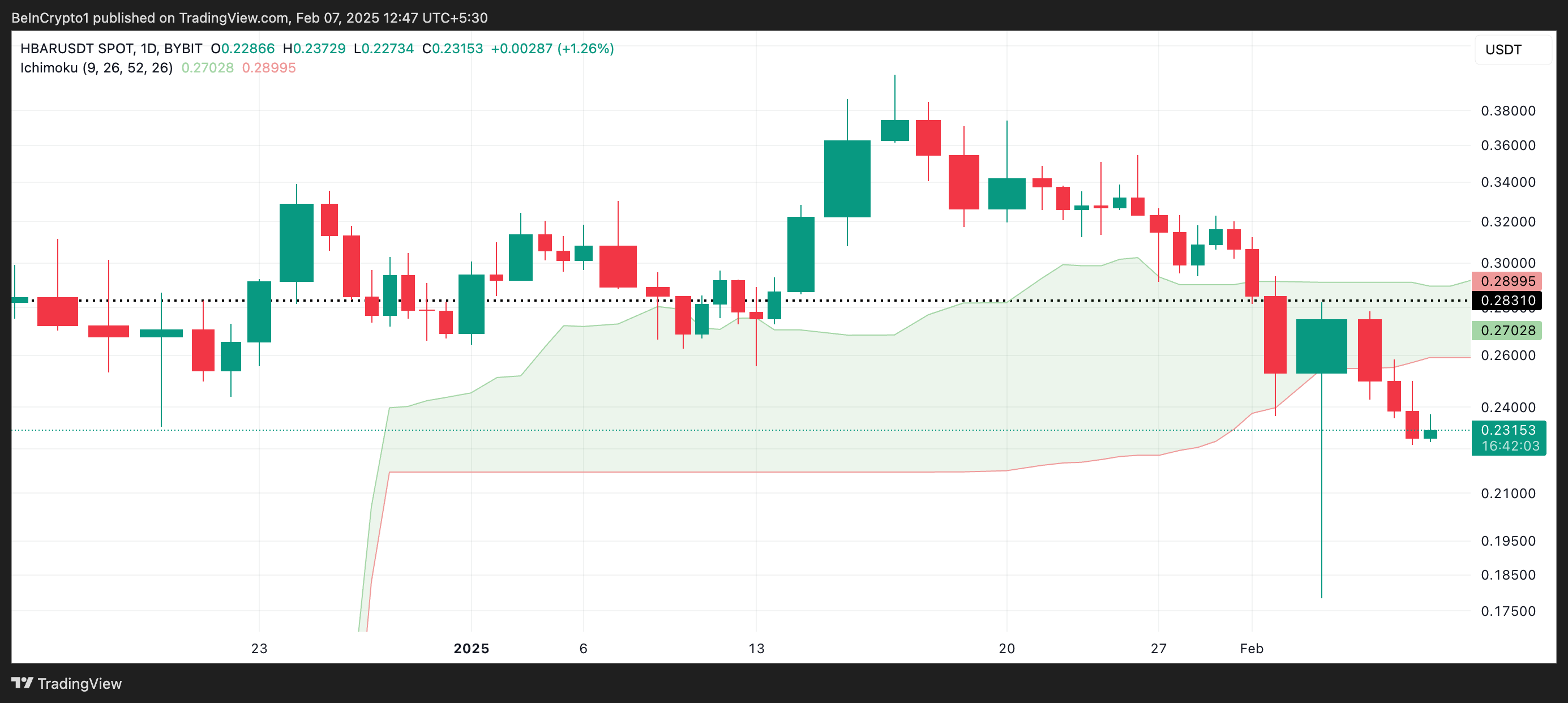 A Ichimoku Cloud é um método usado para medir o momento das tendências de mercado e identificar potenciais níveis de suporte e resistência. Assim, Quando um ativo, como a HBAR, cai abaixo dessa nuvem, isso indica que o mercado está em uma tendência de baixa.