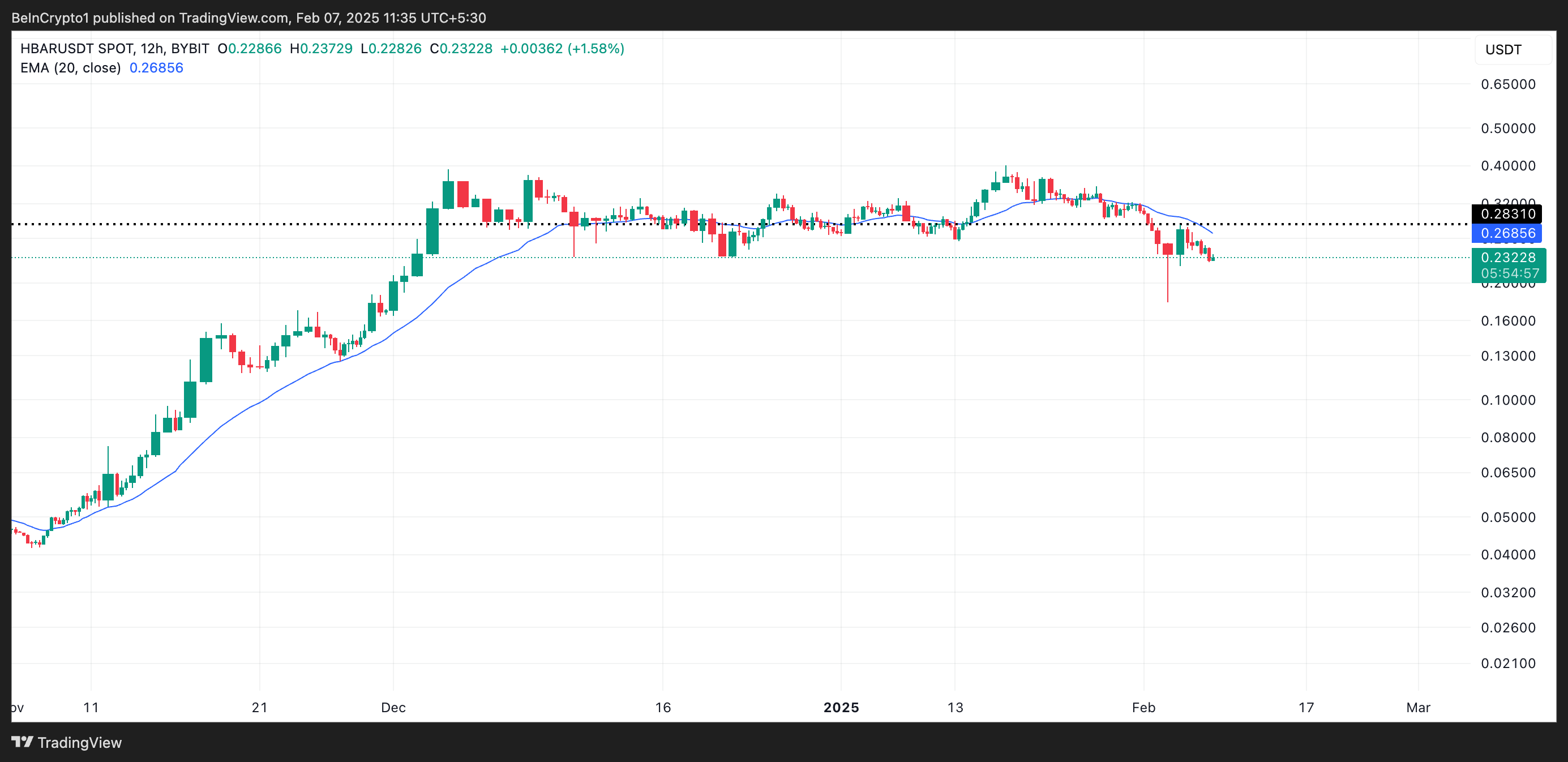 Além disso, a queda significativa do preço da HBAR também a empurrou abaixo da média móvel exponencial (EMA) de 20 dias, o que reforça ainda mais a perspectiva de baixa para o ativo.