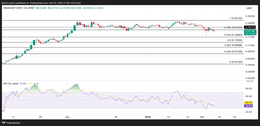 Com 35,58, o RSI da HBAR indica que está em território de baixa, mas ainda não sobrevendido, sugerindo um fraco momento de compra. Se a pressão de venda aumentar, HBAR corre o risco de cair abaixo da zona de preço de US$ 0,20 para negociar a US$ 0,16.