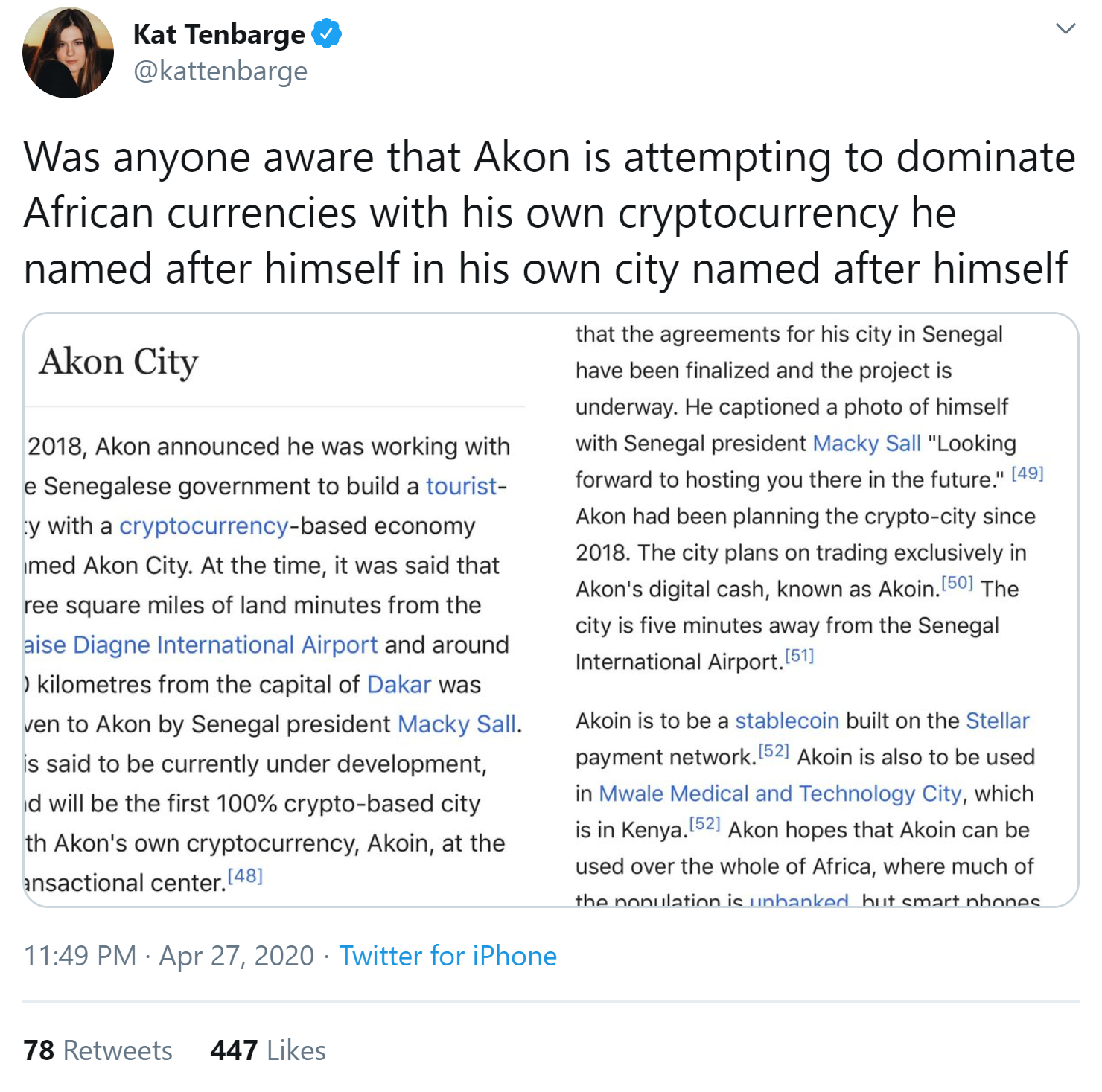 Tenbarge foi ao Twitter ontem à noite para perguntar se alguém estava “ciente de que Akon está tentando dominar as moedas africanas com sua própria criptomoeda que ele deu o nome de si mesmo em sua própria cidade.” A resposta do Cripto Twitter, é claro, foi um retumbante ‘duh!’