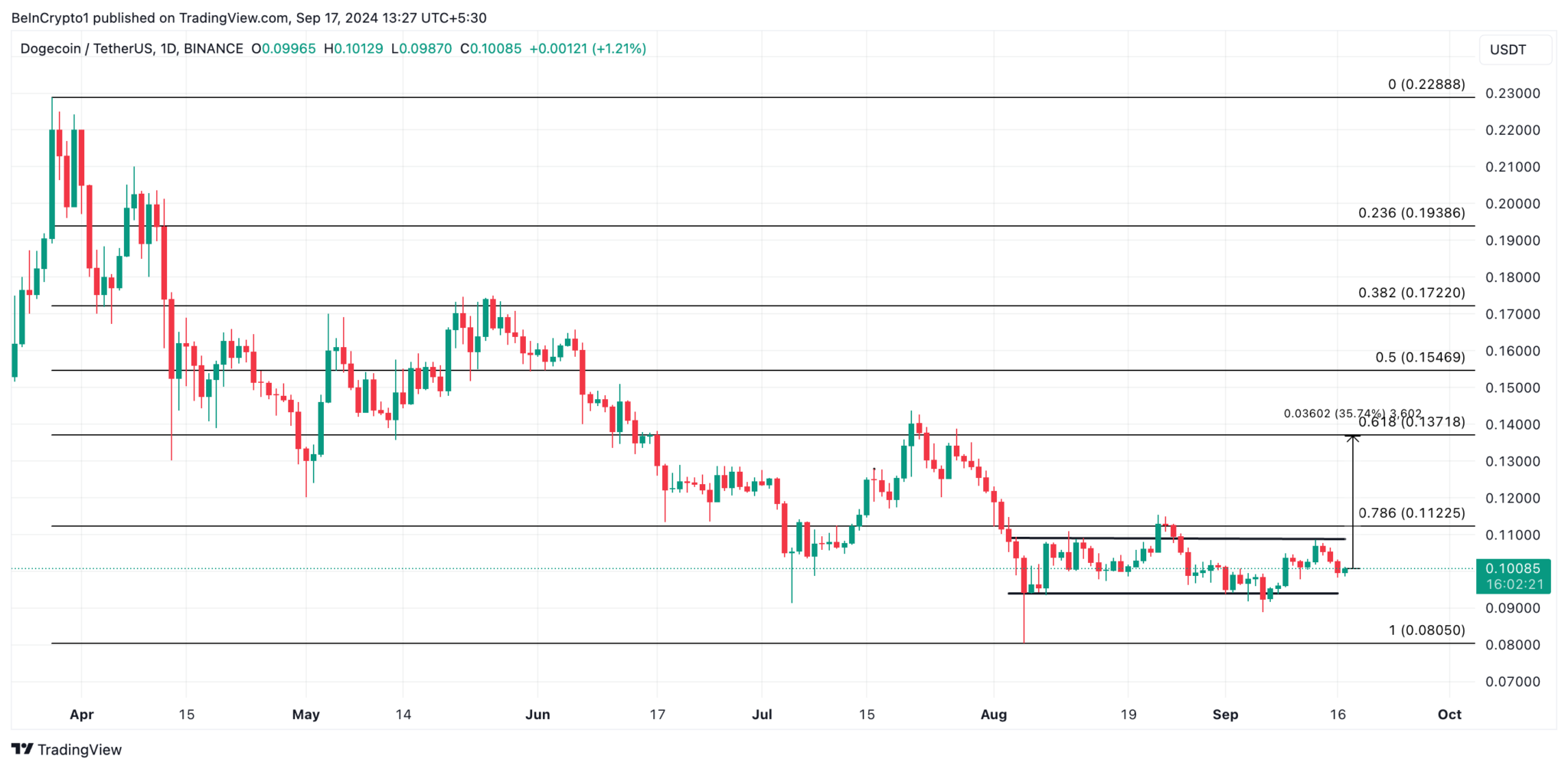 Desde 4 de agosto, a Dogecoin tem sido negociada dentro de um canal horizontal, um padrão onde o preço se move entre uma faixa definida. O limite superior deste canal forma uma resistência em US$ 0,10, enquanto o limite inferior oferece suporte em US$ 0,09.