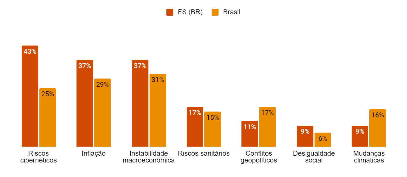 O medo de ataques e ameaças cibernéticas foi apontado por 43% dos presidentes brasileiros. E apenas 9% deles acreditam que as mudanças climáticas possam afetar seus negócios.