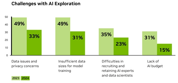 O relatório também revela que a falta de orçamento para IA caiu pela metade. Isso reflete um compromisso crescente com o desenvolvimento da tecnologia no setor financeiro. Ao mesmo tempo, desafios relacionados à coleta de dados e à privacidade estão diminuindo. Isso porque as empresas se tornando mais experientes em gerenciar dados e implantar soluções de IA.