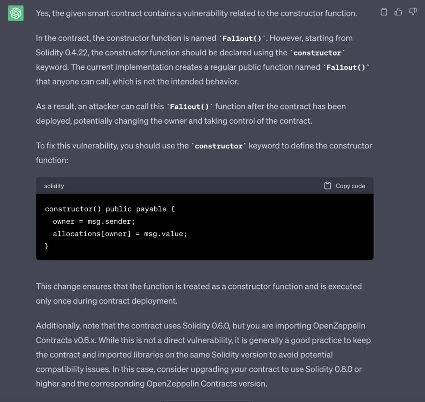 O OpenZeppelin fez um experimento com o GPT-4, dando a ele 28 desafios do Ethernaut, uma rede de jogos de guerra baseada em Solidity web3. Eles consistem em identificar vulnerabilidades em contratos inteligentes e o GPT-4 só conseguiu resolver 19 deles.