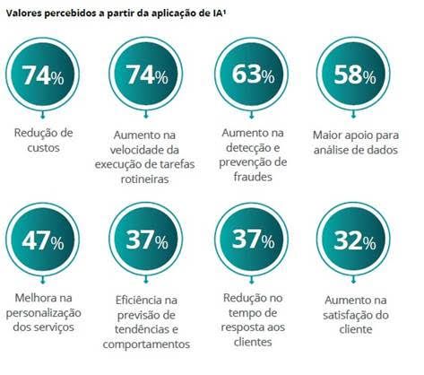 A IA também contribui para a segurança dos dados, identificando riscos (63%), e auxilia na análise de dados (58%). Além disso, 47% dos entrevistados estão usando a tecnologia para personalização de serviços e 37% para previsão de tendências e comportamentos (37%).