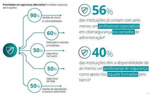 A cibersegurança continua sendo uma prioridade central no setor financeiro. O levantamento indica que, para aumentar a proteção de processos e soluções, os bancos estão reforçando a governança na área.
