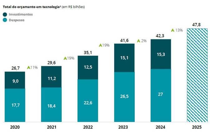 Os bancos brasileiros devem destinar R$ 47,8 bilhões para tecnologia em 2025. O montante representa crescimento de 13% em comparação com 2024, quando o valor foi de R$ 42,3 bilhões.